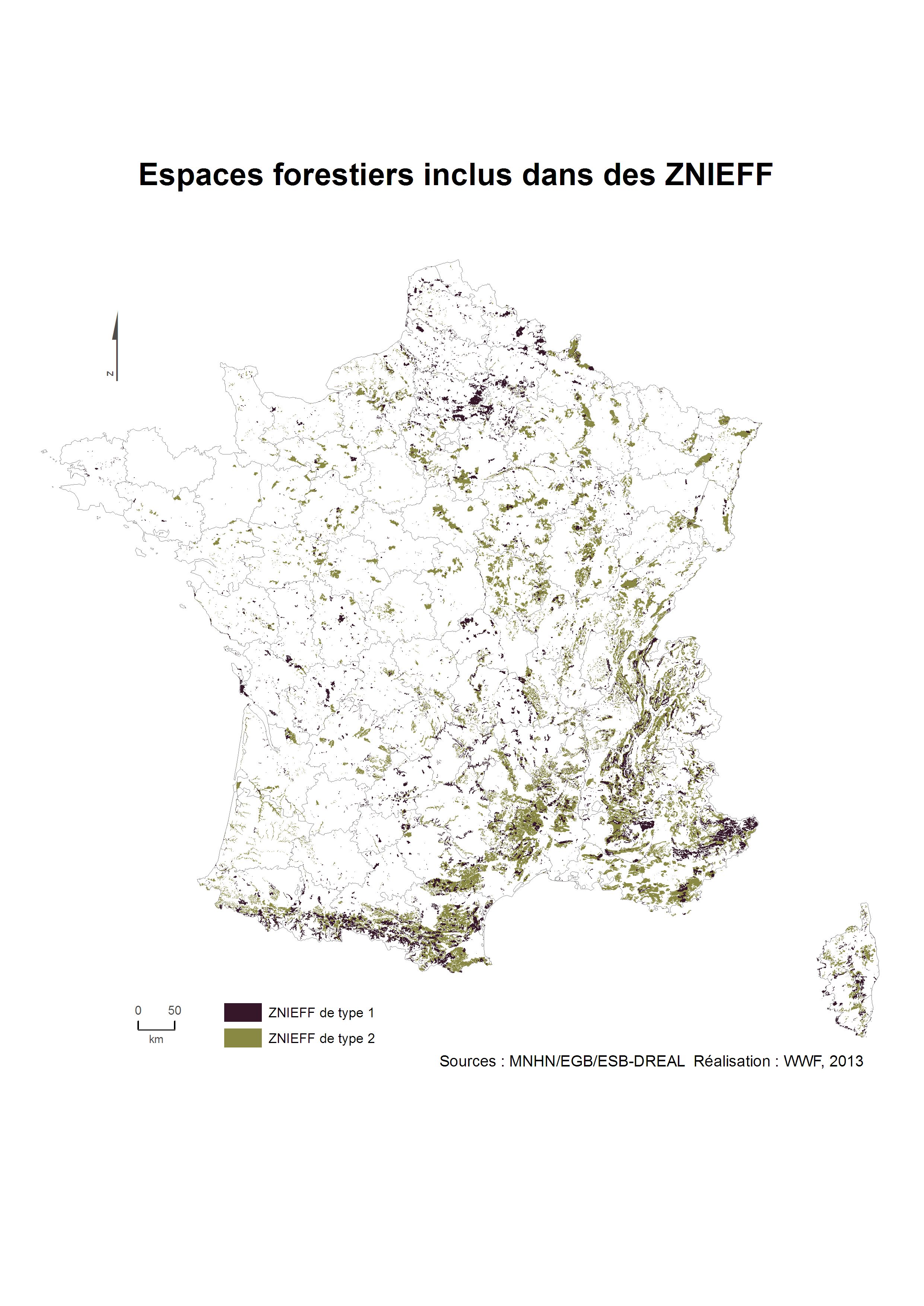 En France, les ZNIEFF de type I et II couvrent respectivement 2,25 millions d’ha et 5,30 millions, soit une intersection ZNIEFF I et/ou II égale à 6,28 millions d’ha, soit 40% des forêts françaises, confirmant que les forêts sont des espaces importants pour la nature.